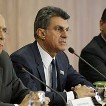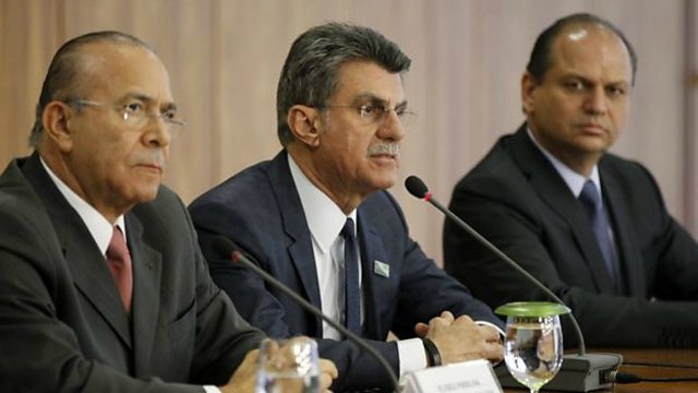 (Picture: Brazil government's chief-of-staff, Eliseu Padilha (L) with new cabinet ministers. Credit: EPA)