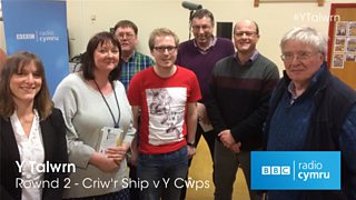 Elis Dafydd o dîm Criw'r Ship a Dafydd John Pritchard o dîm Y Cŵps yn cael 10 marc yr un am eu terngedau i Gwyn Thomas. Y dasg oedd 'telyneg ar y testun Casglu'