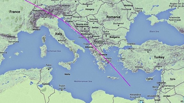 (Photo: Map of flight route of EgyptAir MS804. Credit: Flightradar24/PA)
