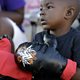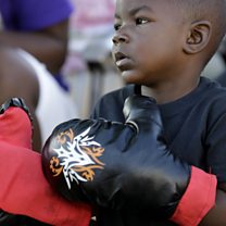 (Photo: young boy wearing boxing gloves awaits funeral procession. Credit: AP.)