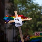 (Photo: A member of Metropolitan Community Church carries a cross with a sign in memory of the victims of the Pulse nightclub shooting. Credit: Getty Images)