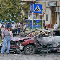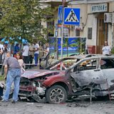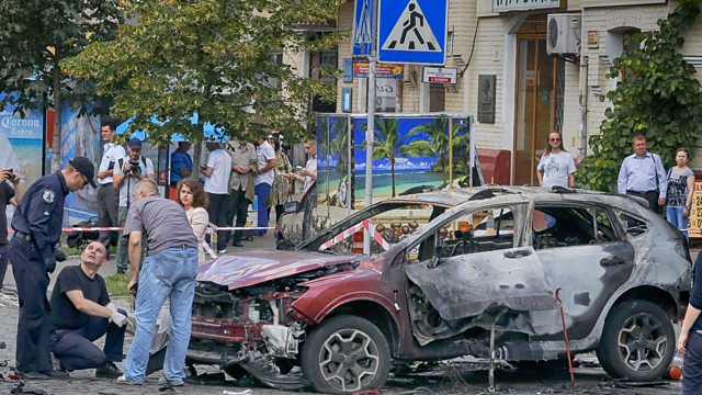 (Photo: Forensic experts examine the wreckage of a burned car in Kiev, Ukraine,
