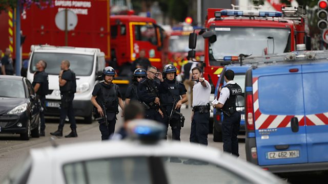 President Hollande says the two men who killed a priest in Rouen claimed allegiance to IS; divisions at the Democratic Party Convention; Amazon delivery drones