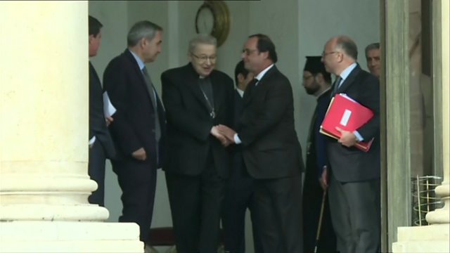 French urged to "overcome hatred" as religious leaders meet President Hollande following Rouen church attack. Also today, Venezuelan children draw pictures of their paltry meals and say "I'm hungry". Fireman Sam controversy over Koran text. More arrests in Turkey. (Photo: Reuters)