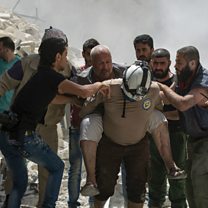 (Photo: Syrians carry a wounded man away from the rubble of a building in the opposition-held district of Al-Mashhad near Aleppo. Credit: Karam al-Masri/AFP/Getty Images)