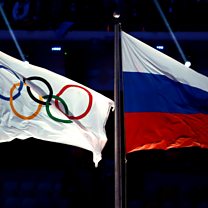 (Pictures: Russian and Olympic flags at Sochi Closing Ceremony 2014. Credit: David Davis/Press Association)