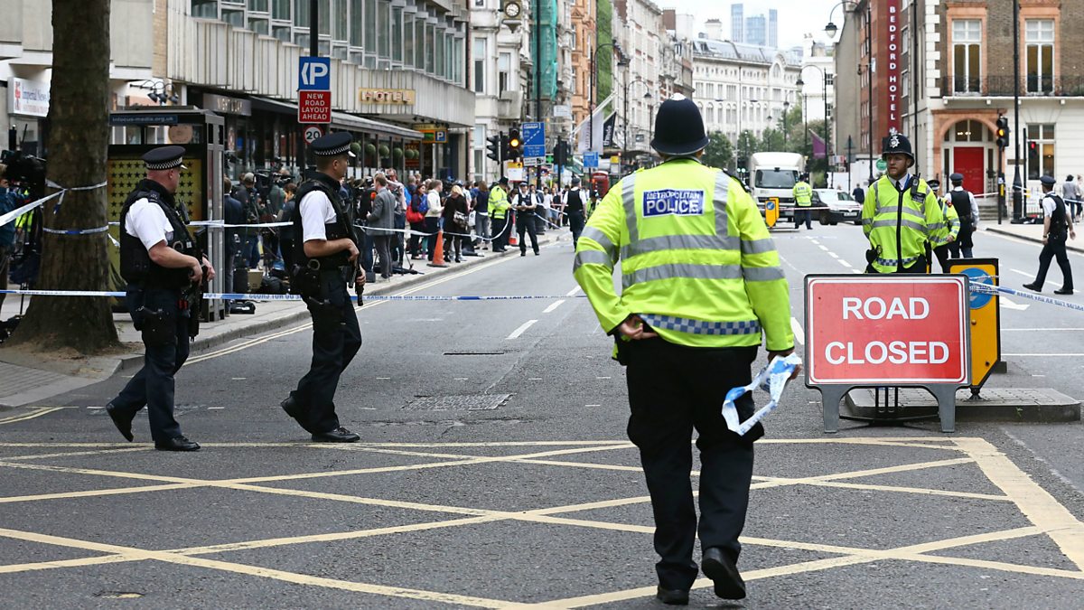 (Photo: Armed police personnel walk past a crime scene in London's Russell Square. Credit: AFP/Getty)