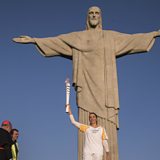 (Photo: Brazilian former volleyball player Isabel Barroso Salgado holds the Olympic flame at Christ The Redeemer Monument in Rio de Janeiro, Brazil. Credit: Getty Images)
