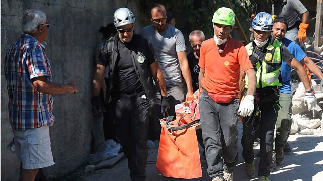 Rescue teams in central Italy are digging through rubble to look for survivors of an earthquake in the Umbria region in the early hours of Tuesday morning. Dozens have been killed and many more are missing. We hear from survivors and reporters in Italy. Also: Turkish tanks roll across the border into northern Syria; German politicians discuss the need to stockpile food and water in the event of a national emergency; and details of the latest crackdown on social media users in Iran.