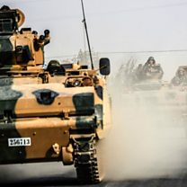 (Image: Turkish Army tanks driving to the Syrian-Turkish border. Credit: Bulent Kilic/Afp)