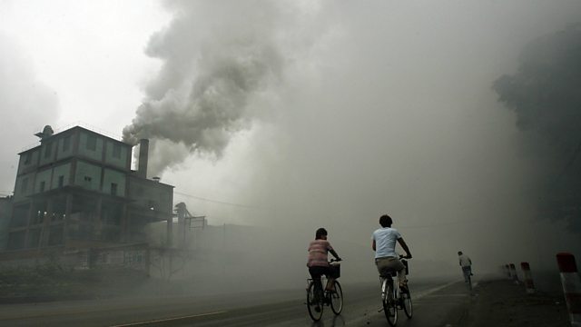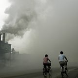 (Photo: Cyclists passing through thick pollution from a factory in China's northwest Hebei province. Credit: AFP/Getty)
