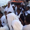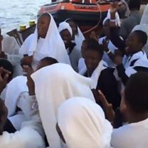(Photo: Migrants and refugees celebrate imminent landing in Italy after being rescued off Libya. Credit: Twitter/@lucyegrey)