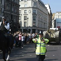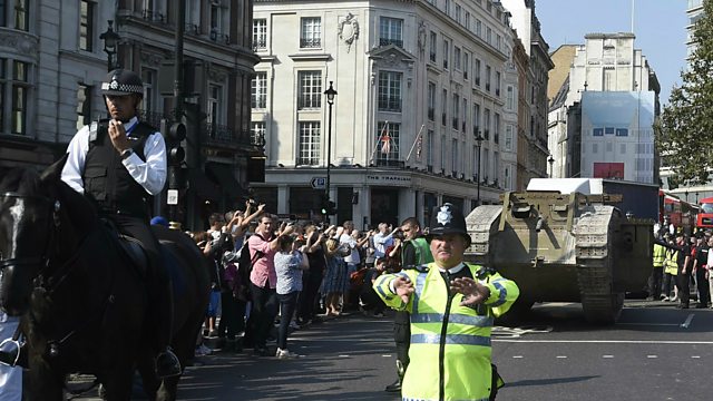 (Photo: Mark IV replica tank drives down a street near Trafalgar Square in London;