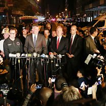 (Photo: New York Police Commissioner James O'Neill (centre right) and Mayor Bill de Blasio (centre left) speak at a press conference at the scene of the explosion in Manhattan. Credit: Spencer Platt/Getty Images)