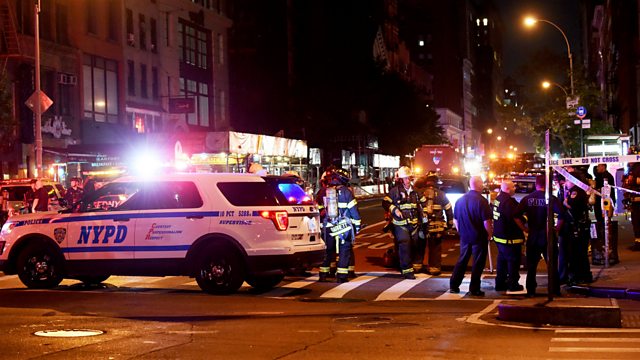 (Photo: Police officers and firefighters respond to the explosion in the Chelsea neighbourhood of New York City. Credit: Jamie McCarthy/Getty Images)