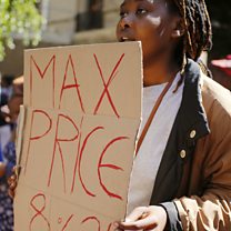 (Photo: A student at Cape Town University holds a placard reading "Max Price 8%?". Credit: AP)