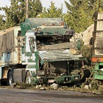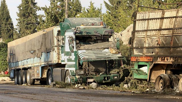 (Photo: Damaged trucks carrying aid, in Aleppo Credit: Aleppo 24 News/Associated Press)