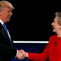 (Photo: Republican US presidential nominee Donald Trump and Democratic U.S. presidential nominee Hillary Clinton shake hands at the end of their first presidential debate. Credit:Mike Segar/Reuters)