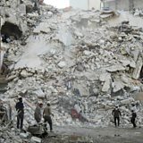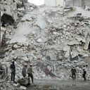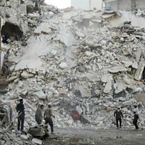 (Photo: Members of the Syrian Civil Defence (the White Helmets) search for victims in the rubble of a destroyed building in Aleppo. Credit: Karam al-Masri/AFP/Getty Images.)