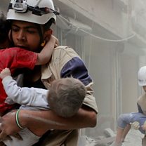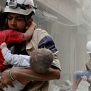 Photo: Members of the Civil Defence rescue children after an air strike in Aleppo. Credit: Reuters