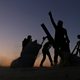 Photograph shows fighters from the Free Syrian Army cheering and reacting as they fighting against the Islamic State (IS) group jihadists on the outskirts of the northern Syrian town of Dabiq. (Credit: AFP/Getty Images)