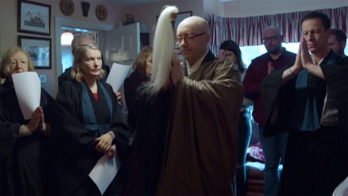 Family and friends gather in a Zen Buddhist service to mark Liam Clarke's life.