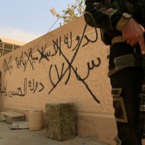 (Image: An Iraqi special forces soldier stands beside graffiti, which reads: "The Islamic State will remain". Credit: Reuters/Zohra Bensemra)