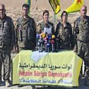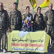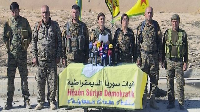 Photograph shows officials with the U.S.-backed Syria Democratic Forces at a press conference in northern Syria. (Credit: Associated Press)