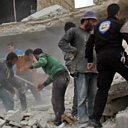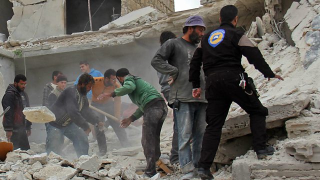 (Picture: Civilians inspect rubble after Russian airstrikes in Idlib Province: Credit: AFP/Getty Images )