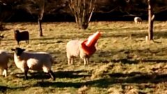 Sheep gets head stuck in cone