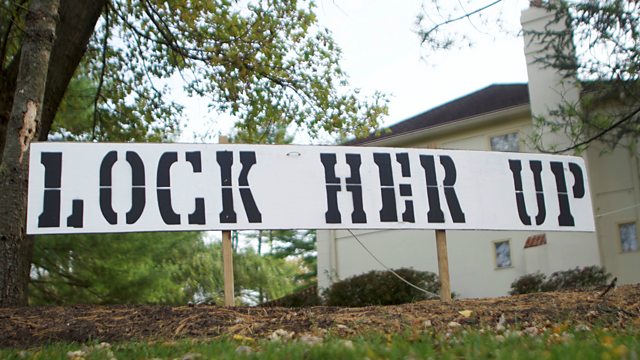 (Photo: 'Lock her Up' sign referring to Hilliary Clinton outside a residence in King of Prussia, Pennsylvania. Credit: REU)