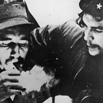 (Photo: Fidel Castro, left, lights his cigar while Argentine revolutionary, Che Guevara, looks on in the early days of their guerrilla campaign in Cuba's Sierra Maestra Mountains, mid-1950s. Credit: Hulton Archive/Getty Images)