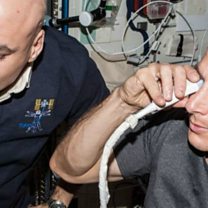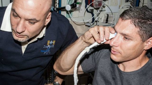 (Photo:Astronauts research vision changes on the International Space Station. Credit: NASA)