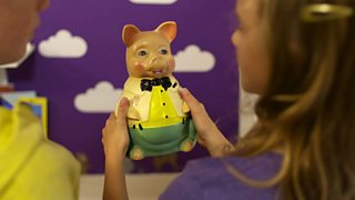Mae Loli'n benderfynol o gael arian o'i chadw-mi-gei ond mae'r mochyn yn bod yn ystyfni...