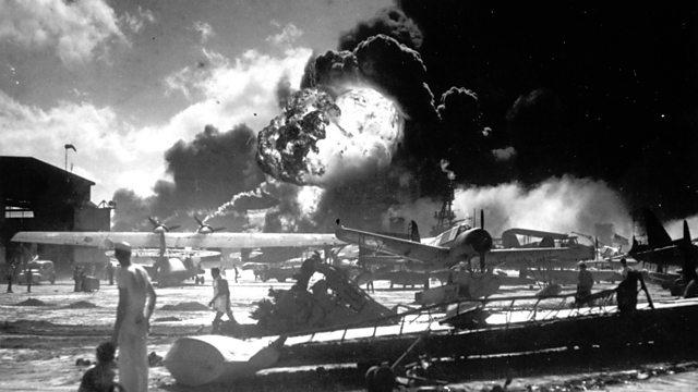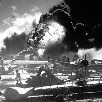 (Photo: Sailors stand among wrecked airplanes at Ford Island Naval Air Station as they watch the explosion of the USS Shaw in the background during the Japanese surprise attack on Pearl Harbor, December 7th, 1941. Credit: Associated Press)