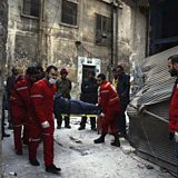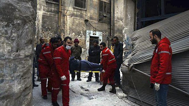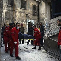 (Photo: Members of the Syrian Arab Red Crescent carrying a patient on a stretcher in the Old City of Aleppo, Syria. Credit AP)