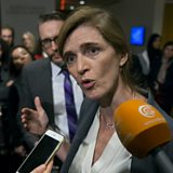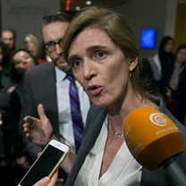 (Picture: US Ambassador to the U N Samantha Power speaking to reporters announcing a compromise agreement on Aleppo. Credit AP)