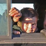 (Photo: Evacuated child through bus window. Credit: AFP)