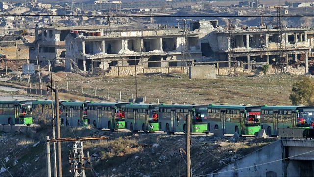 (Photo: Buses line up for the evacuation operation of rebel fighters and their families from rebel-held neighbourhoods of Aleppo. Credit: George Ourfalian / AFP / Getty Images