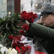 (Image: A Russian soldier places flowers at a small memorial in Moscow. Credit: Epa/Maxim Shipenkov)