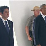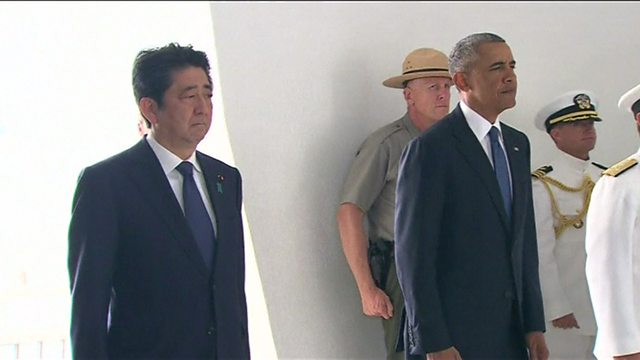 (Photo: Obama and Abe at the USS Arizona Memorial, built over the remains of the sunken battleship USS Arizona. Credit: Reuters).