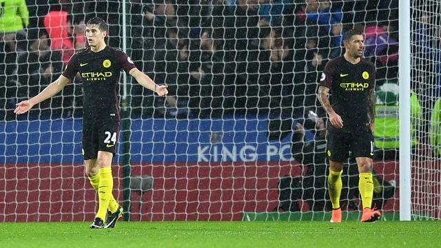 Jamie Vardy scored a hat-trick as Leicester City beat Manchester City 4-2 at the King Power Stadium, you will hear from Claudio Ranieri and Pep Guardiola as Mark Chapman rounds up Saturday's action. Bob Bradley and Gylfi Sigurdsson discuss Swansea's victory over Sunderland which saw them move out of the Premier League relegation zone, and there is reaction to a thrilling 3-3 draw between Hull and Crystal Palace.
