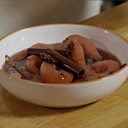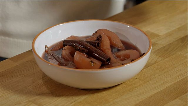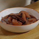 An easy and wintery pudding - pears poached in red wine with star anise and cinnamon.