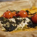 Sea bass with vine tomatoes, sweet potatoes and laverbread.