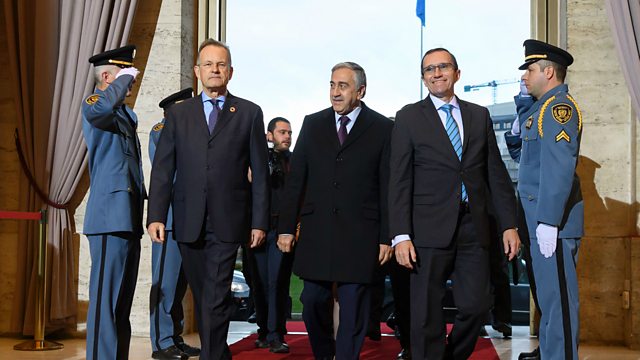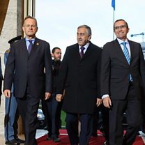 (Photograph shows leaders arriving at the Cyprus peace talks. Credit: AFP/Getty Images)