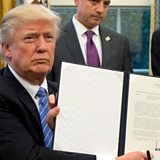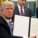 (Photo: President Donald Trump shows the Executive Order withdrawing the US from the Trans-Pacific Partnership, 2017. Credit: Ron Sachs/Getty Images)