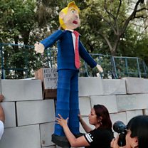 ( Picture: People protest against US President Donald Trump in Mexico next to a fake wall. Credit AFP)