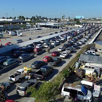 (Photo: Aerial view of motorists waiting to cross the border bridge between Mexico and the United States at Tijuana. Credit: AFP)