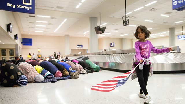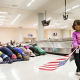 (Photo: A young girl dances with an American flag in baggage reclaim while women pray behind her during a protest against the travel ban imposed by the US Credit: Reuters)