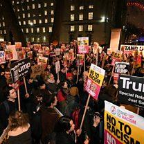 Thousands of people have joined protests in London and cities across the UK against Donald Trump's controversial ban on seven mainly Muslim countries. We speak to Trump's former economic advisor, Betsy McCaughey.